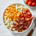 Gently fold in the grape tomatoes, sharp cheddar cheese cubes, and chopped crispy bacon. The tomatoes add freshness, the cheese brings little bursts of savoriness, and the bacon offers that addictive crunch and smokiness, creating a delightful texture and flavor balance.