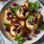 This delightful recipe features baked pears stuffed with a creamy goat cheese mixture, sweetened with honey, dried cranberries, and crunchy nuts. The pears are baked until tender and lightly browned, making a perfect warm dessert or elegant appetizer served with a garnish of fresh mint leaves.