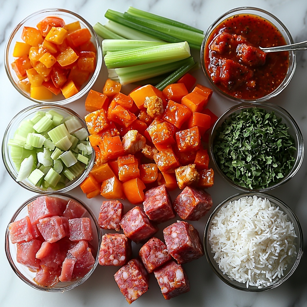 Getting the right ingredients is half the fun in making this jambalaya, and luckily, each one plays a starring role in building layers of flavor and texture. From the savory sausage and chicken that bring heartiness, to the fresh trinity of vegetables, and the aromatic herbs and spices that pack the authentic Cajun punch—each component is essential to crafting the perfect dish.