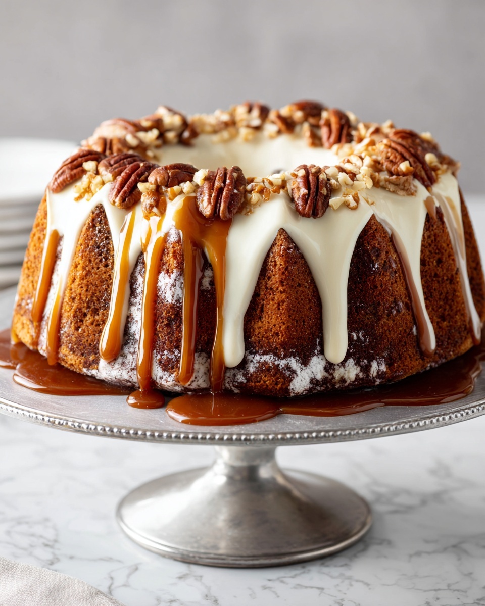 Serve this cake on a pretty cake stand to showcase its beautiful shape and glossy glaze. For gatherings, slice and serve on individual plates with a drizzle of caramel sauce and a pecan on the side to create a mini dessert experience. You could even pair slices with a warm cup of coffee or chai tea for the ultimate cozy treat.