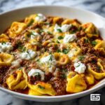 This Cheesy Beef Enchilada Tortellini is a flavorful fusion dish combining tender cheese tortellini with a spicy enchilada-style ground beef sauce, topped with melted mozzarella and cheddar cheese and finished with a creamy touch of sour cream and fresh cilantro. A hearty and comforting meal perfect for a quick weeknight dinner.