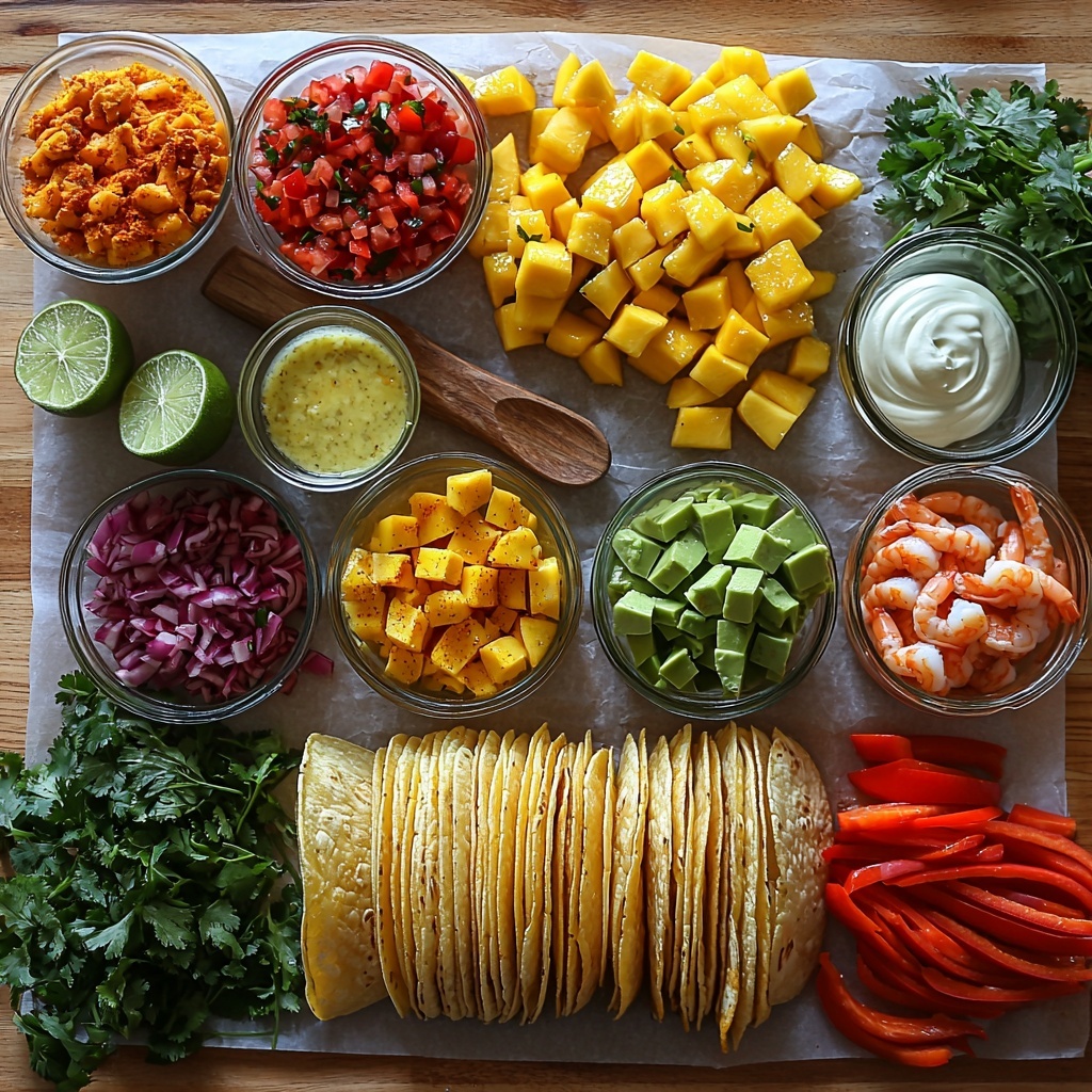 To bring it all together, warm your toasted corn tortillas and layer in some shredded green cabbage. Top the cabbage with 4 to 5 shrimp, then spoon on a generous amount of mango salsa. Finish with a drizzle of Mexican crema and a sprinkle of fresh cilantro for an extra burst of flavor. These tacos are colorful, vibrant, and bursting with a variety of textures and tastes that will make every bite memorable.
