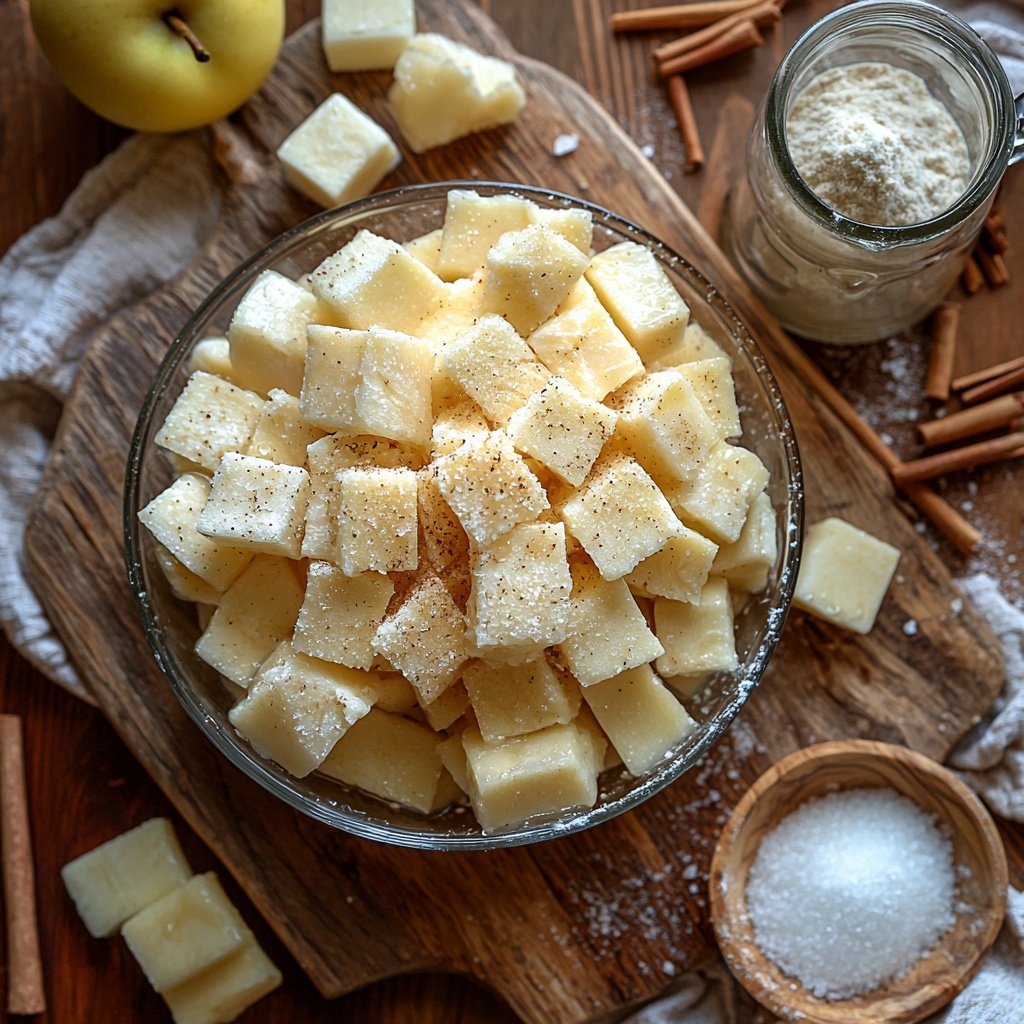 In a large bowl, toss the peeled and sliced apples with sugar, lemon juice, cinnamon, nutmeg, and flour. This mix of spices and lemon juice ensures every bite bursts with spiced, tart-sweet flavor while the flour keeps the filling from getting runny.