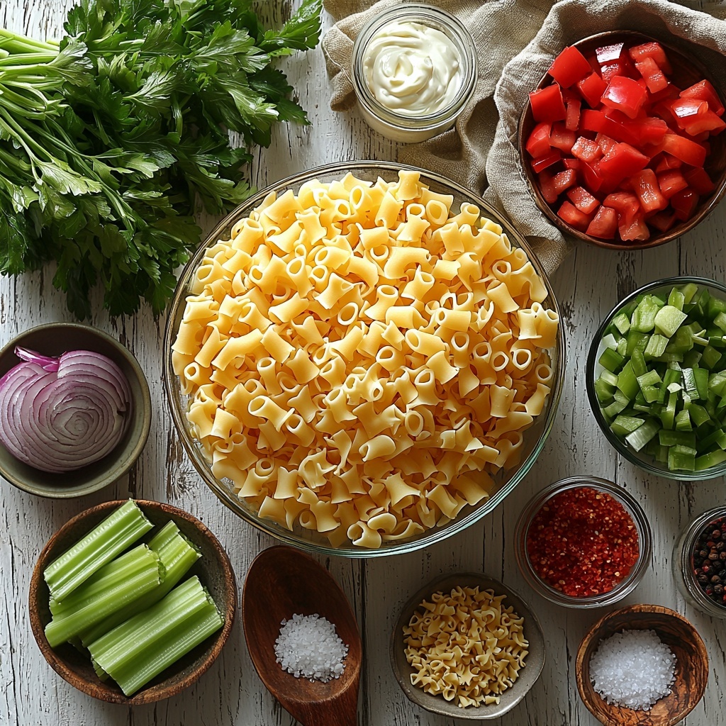 These ingredients are straightforward and easy to find, yet each one plays a vital role in the overall success of the salad. From the tender elbow macaroni providing a chewy base to the crisp veggies adding pops of color and texture, every component enhances the Classic Macaroni Salad Recipe’s appeal and taste.