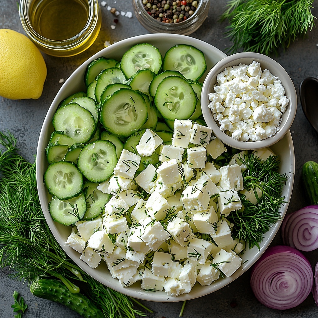 A refreshing and light Cucumber Feta Salad combining crisp cucumbers, tangy red onions, fresh herbs, and creamy feta cheese, all tossed in a zesty lemon-olive oil dressing. Perfect as a quick side dish or a healthy snack, this salad requires no cooking and is ready in just 15 minutes.