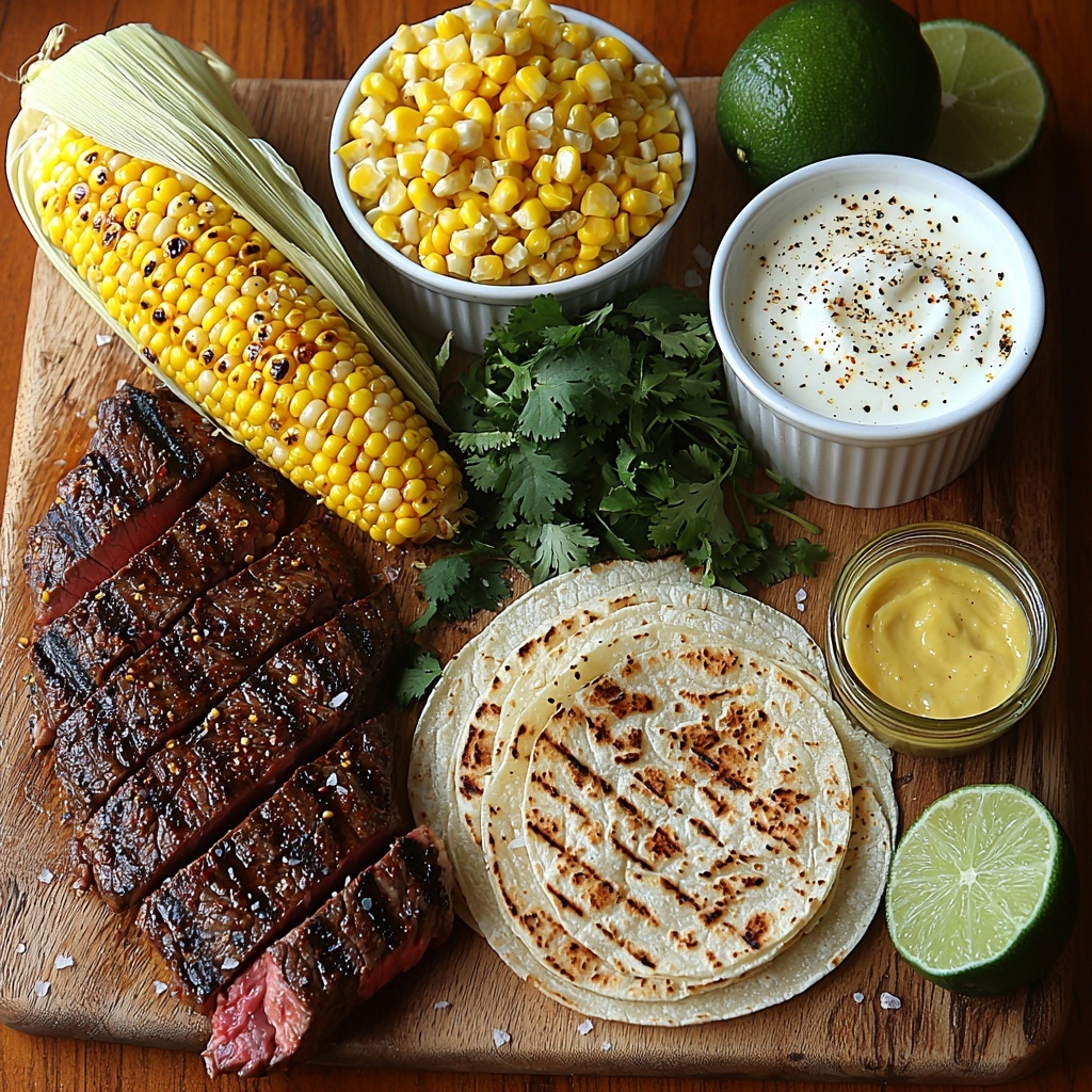 It’s time to build the magic! On each warm tortilla, start with a few slices of your juicy steak, add a generous handful of grilled corn, sprinkle cotija cheese, drizzle Mexican crema, and garnish with fresh cilantro. Each layer adds a new dimension of flavor and texture that will make every bite unforgettable.