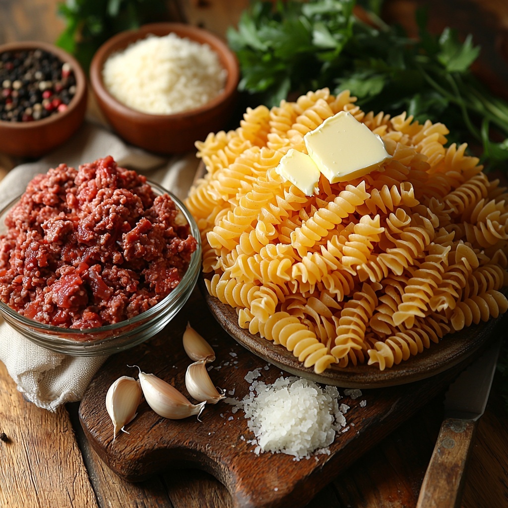 - Combine Pasta and Sauce: Return the cooked pasta to the skillet, tossing to coat the pasta evenly in the garlic butter. Season with salt and black pepper. Stir in the browned ground beef until combined.