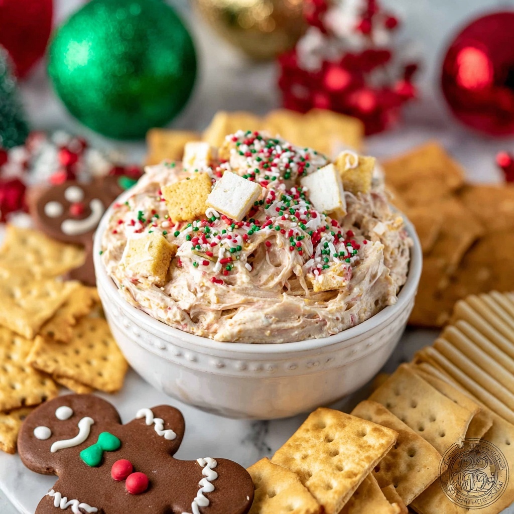 Serve the dip in a decorative holiday bowl or a hollowed-out pineapple for a fun twist. You can also pipe the dip into a Christmas tree shape on a platter and decorate it like a real tree using sprinkles, mini candies, and edible glitter.