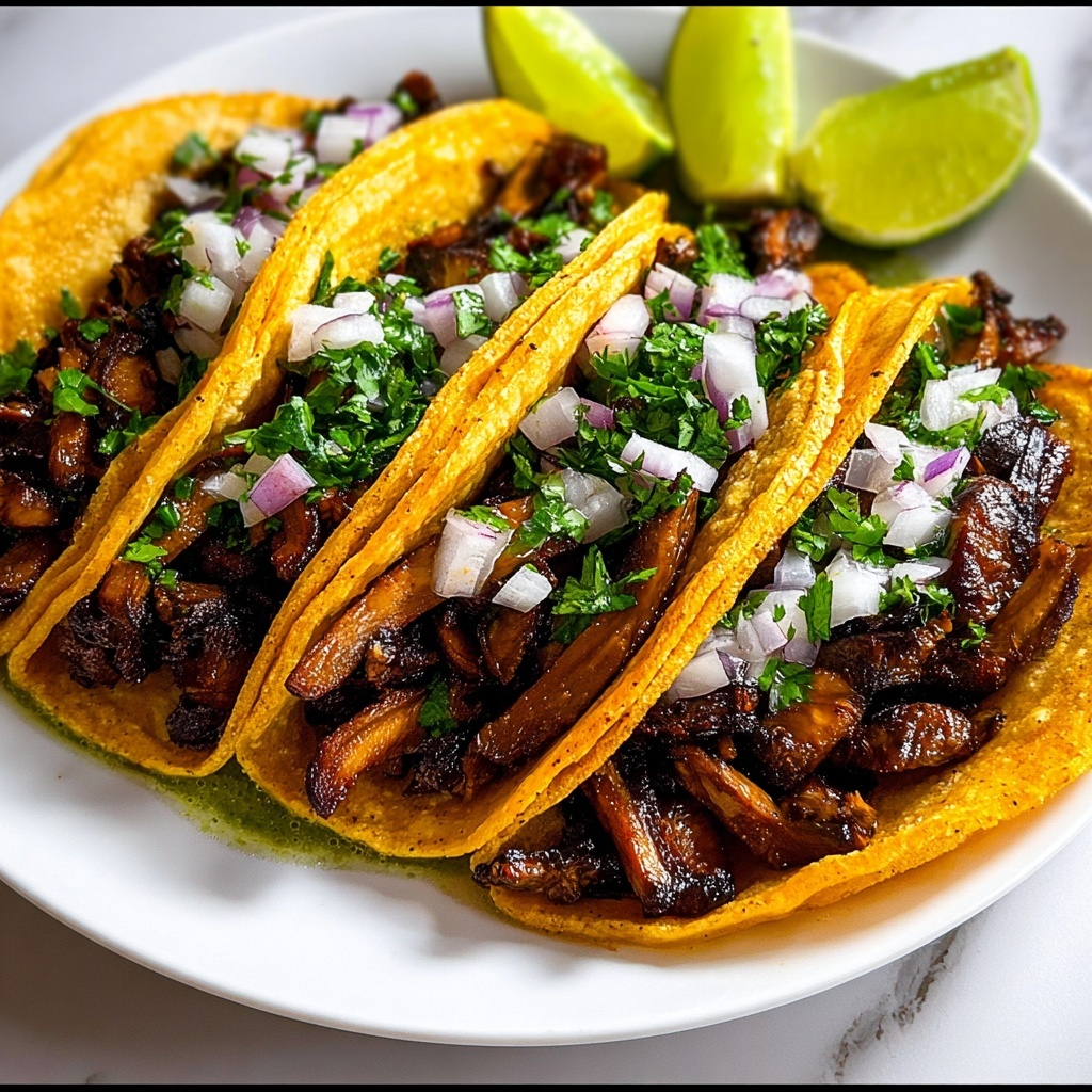 Fill each warm tortilla generously with the sautéed mushrooms. Top with chopped onion and fresh cilantro, then finish with a generous squeeze of lime juice. Serve these instantly to enjoy the perfect combination of textures and flavors that make this Mushroom Tacos That Taste Like Heaven Recipe truly unforgettable.