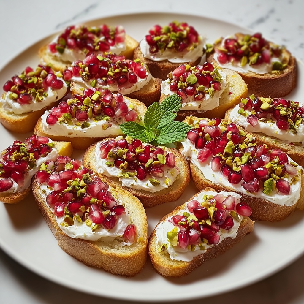 These Pomegranate Pistachio Crostinis are a delightful and colorful appetizer featuring crispy toasted baguette slices topped with creamy ricotta, juicy pomegranate seeds, crunchy pistachios, honey drizzle, and fresh mint. Perfect for entertaining or a light snack, they combine sweet, nutty, and fresh flavors with a satisfying crunch.