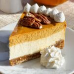 Before serving, dress your Pumpkin Pie Cheesecake Recipe with a generous dollop of freshly whipped cream and toasted pecans if you like. The cream adds a fresh, airy contrast, while the pecans provide a delightful crunch to each indulgent slice.