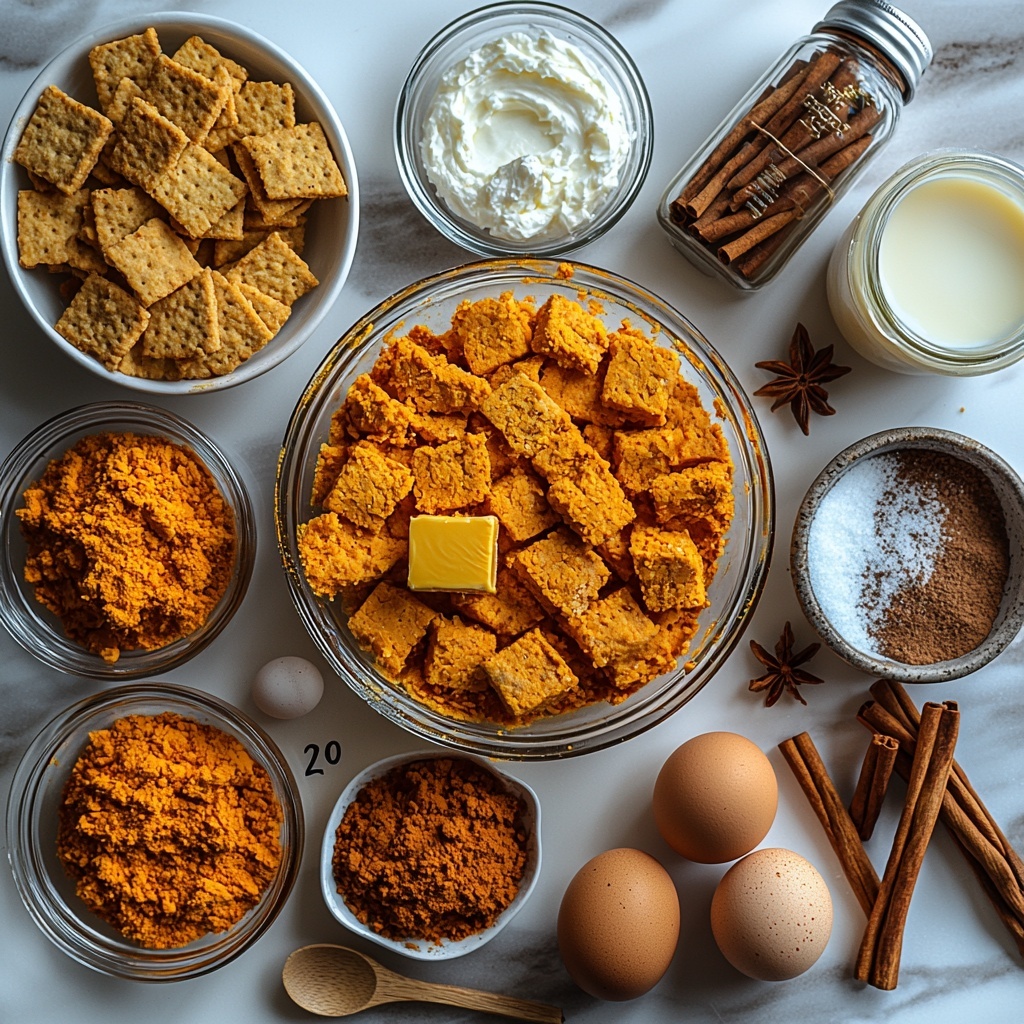 Getting started on your Pumpkin Pie Cheesecake Recipe means gathering some simple, yet incredibly essential ingredients. Each plays a key role in bringing out the perfect balance of creamy richness, gentle sweetness, and warm autumn spices that make this dessert unforgettable.