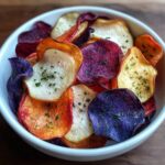 Enjoy a colorful and crispy snack with these Red, White, and Blue Potato Chips. Made from thinly sliced red, white, and blue potatoes seasoned with olive oil, sea salt, and fresh herbs, these homemade chips are baked to golden perfection, offering a healthier alternative to fried snacks.