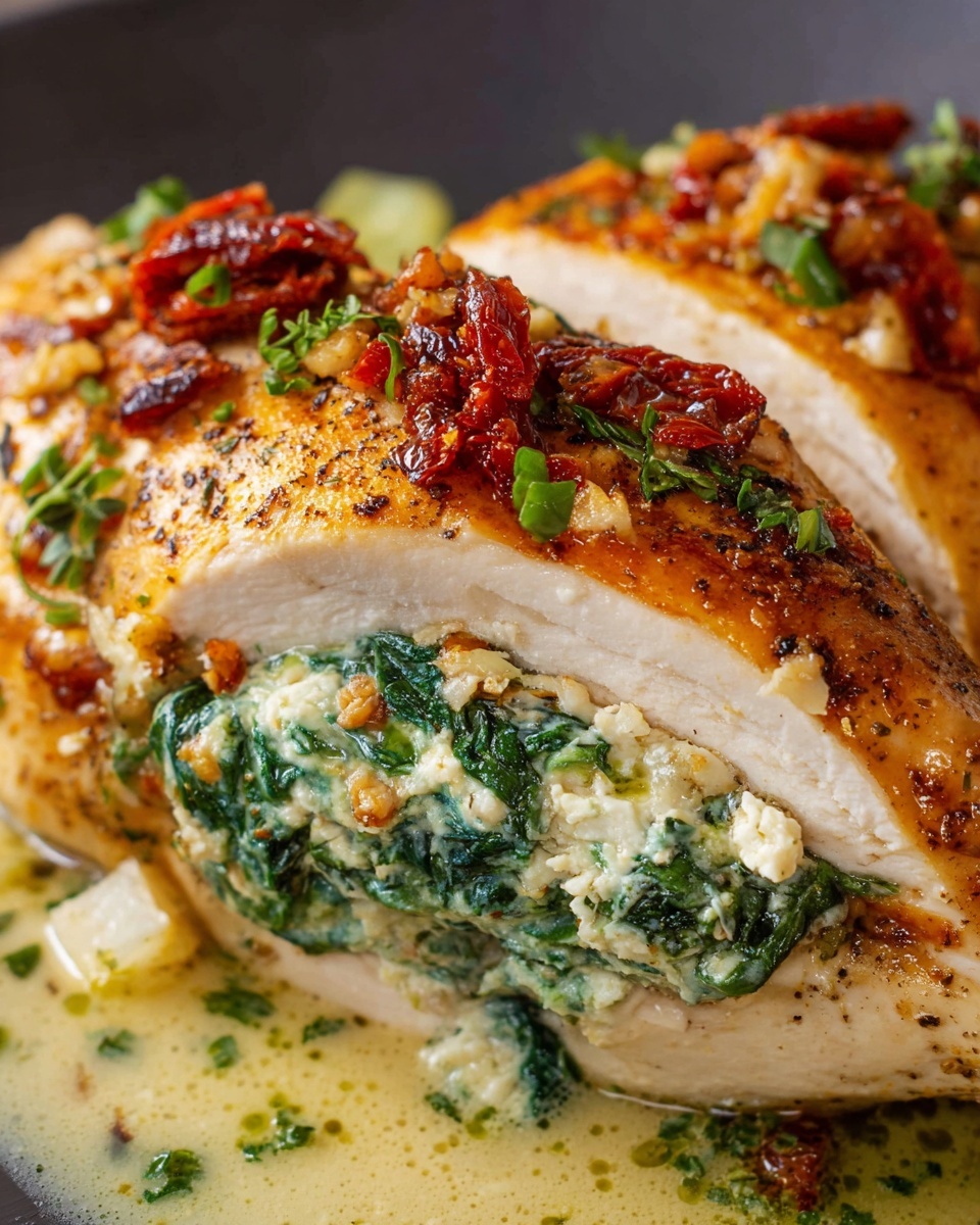 Slice the stuffed chicken breast on a diagonal to showcase that amazing cheesy spinach filling inside—this makes for a stunning presentation. Alternatively, serve whole and spoon a bit of warm tomato sauce or a garlic butter drizzle over the top for an extra layer of flavor and elegance.