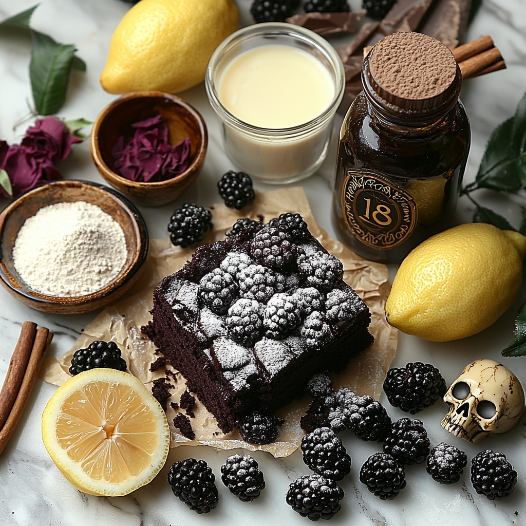 Gathering the right ingredients makes all the difference in creating a cake that is both visually stunning and irresistibly delicious. Each item here plays a crucial role—from the black cocoa powder that gives the cake its signature color, to the fresh blackberries that add a bright, tangy contrast.